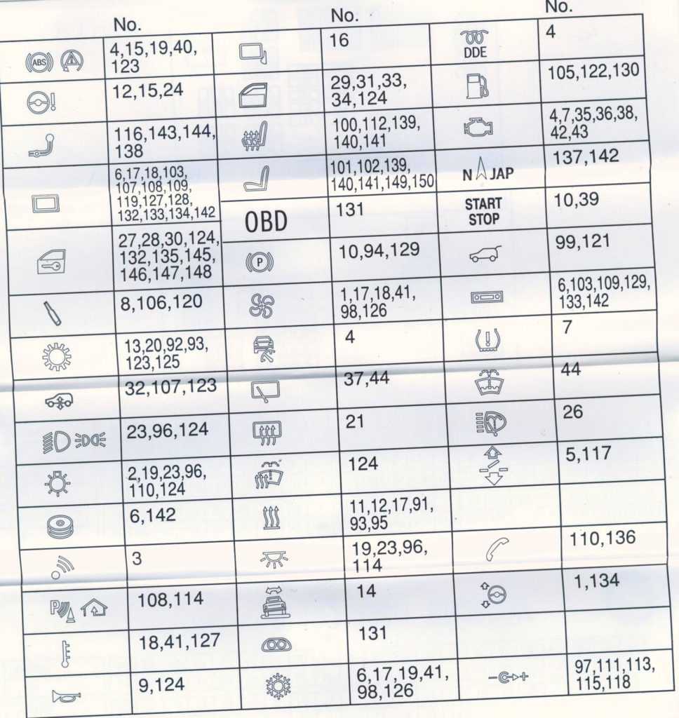 RELEASE PARKINGBRAKE-Отпустить стояночный тормоз CHECK BRAKE FLUID-Проверить уровень тормозной жидкости STOP! ENGINE OILPRESS-Стоп! Низкое давление масла в двигателе COOLANT TEMPERATURE-Температура охлаждающей жидкости* BOOTLID OPEN-Открыт багажник DOOR OPEN-Открыта дверь CHECK BRAKE LIGHTS-Проверить стоп-сигналы CHECK LOWBEAM LIGHTS-Проверить ближний свет CHECK TAIL LIGHTS-Проверить свет задних фонарей CHECK PARK LIGHTS-Проверить габаритный свет CHECK FRONT FOGLAMP-Проверить свет пер. противотуманных фар CHEK REAR FOGLAMP-Проверить свет задних противотуманных фар CHECK NUMPLATE LIGHT-Проверить освещение номерных знаков CHECK TRAILER LIGHTS-Проверить фонари прицепа CHECK HIGHBEAM LIGHT-Проверить дальний свет CHECK REVERSE LIGHTS-Проверить фонари заднего хода TRANS. FAILSAFE PROG-Аварийная программа АКПП CHECK BRAKE LININGS-Проверить тормозные колодки WASHER FLUID LOW-Долить воды в бачок омывателя CHECK ENGINE OIL LEV-Проверить уровень масла в двигателе IGNITION KEY BATTERY-Заменить аккумулятор ключа зажигания CHECK COOLANT LEVEL-Проверить уровень охлаждающей жидкости LIGHTS ON?-Включен свет? CHECK STEERING FLUID LEV-Проверить масло гидропривода рулевого управления