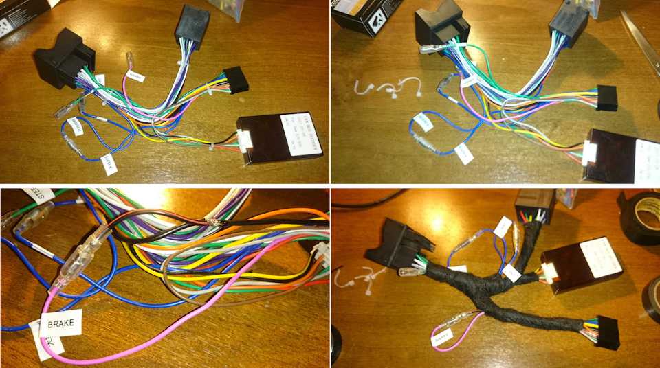 ну и попутно занимаемся проводкой. совсем не устроил меня жгут из комплекта. по порядку фото в коллаже:1 — такой он был2 — срезал стяжки которые натирали провода3 — сделал клемму массы для провода BRAKE чтобы DVD всегда показывало (если он вообще его блокирует, я хз)4 — замотал матерчатой изолентой как с завода