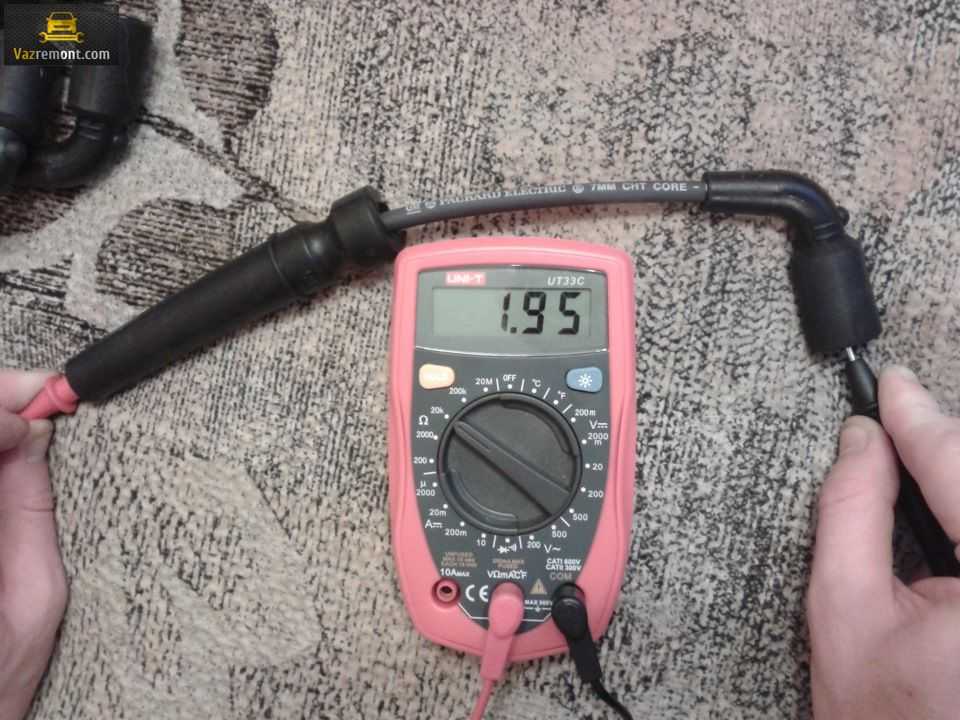 Можно также проверить сопротивление высоковольтных проводов, для этого вам понадобится мультиметр. — Включите режим омметра. — Снимите провод со свечи первого цилиндра и катушки зажигания. — Подключите электроды мультиметра к концам провода и посмотрите на показания.