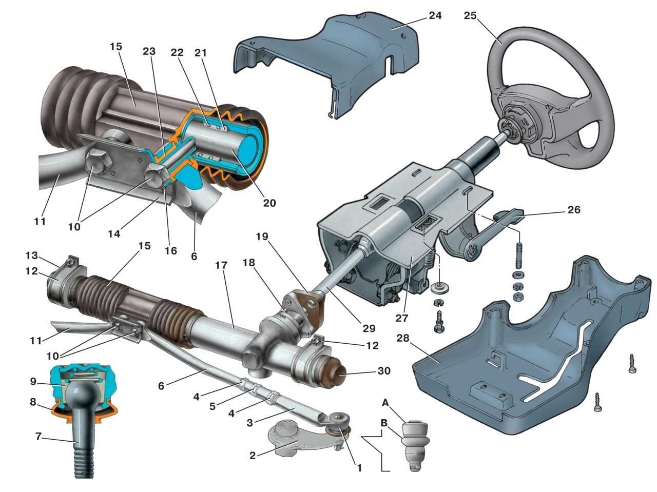 | Рис. 5.1. Рулевое управление: 1 – шаровый шарнир наконечника рулевой тяги; 2 – поворотный рычаг; 3 – наконечник рулевой тяги; 4 – контргайка; 5 – тяга; 6, 11 – внутренние наконечники рулевых тяг; 7 – палец шарового шарнира; 8 – защитный колпачок; 9 – вкладыш шарового пальца; 10 – болты крепления рулевых тяг к рейке; 12 – скоба крепления рулевого механизма; 13 – опора рулевого механизма; 14 – соединительная пластина; 15 – защитный чехол; 16 – стопорная пластина; 17 – картер рулевого механизма; 18 – стяжной болт; 19 – соединительная эластичная муфта; 20 – рейка; 21 – опорная втулка рейки; 22 – демпфирующее кольцо; 23 – резинометаллический шарнир; 24 – облицовочный кожух (верхняя часть); 25 – рулевое колесо; 26 – рычаг регулировки положения рулевой колонки; 27 – кронштейн крепления вала рулевого управления; 28 – облицовочный кожух (нижняя часть); 29 – промежуточный вал рулевого управления; 30 – защитный колпачок; А — поверхность корпуса шарового шарнира; В — поверхность поворотного рычага |