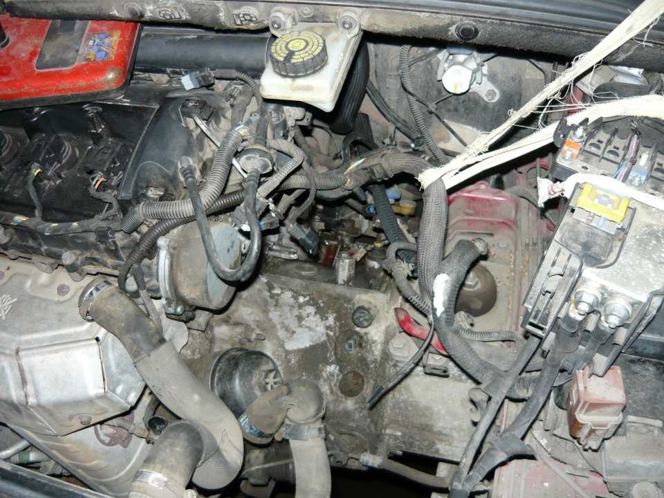 Конечно было бы удобнее вытащить полностью кожух, но там к нему прикреплены куча шлангов, которые геморно отсоединять и я не стал с этим заморачиваться. Отсоединяем разъем датчика термостата, подставляем резервуар под патрубки для слива охлаждающей жидкости.