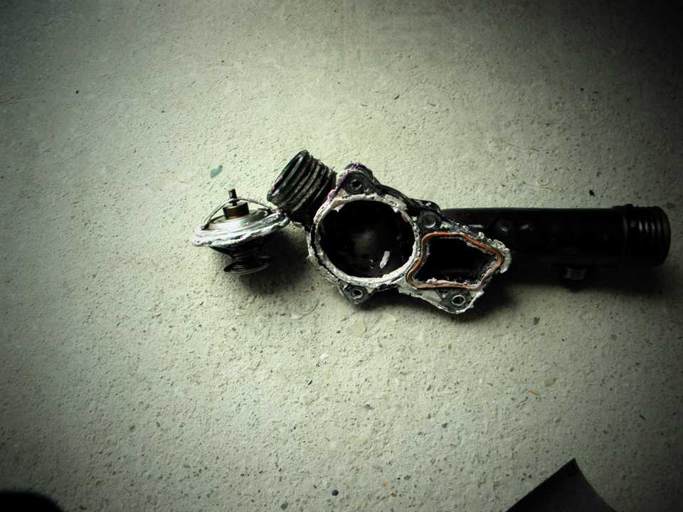 Отсоединяем патрубки, откручиваем 4 болта термостата и вытаскиваем. Мой старый был оригинальный, с шильдиком BMW — фирмы Behr!