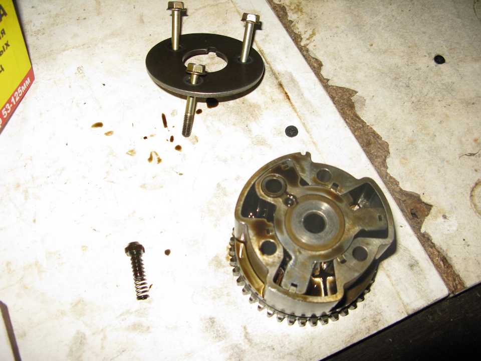 И начинаем думать как взвести фазовращатель. В книге написано что нельзя разбирать его, но нашел видео, где человек наглядно показал как его разобрать, разблокировать фазовращатель и собрать обратно и блокируем его шестигранником. Так и сделал, откручиваем 3 болта, вынимаем клапан с пружиной и отверткой разблокируем его, достав блокировочный поршенек и собираем обратно