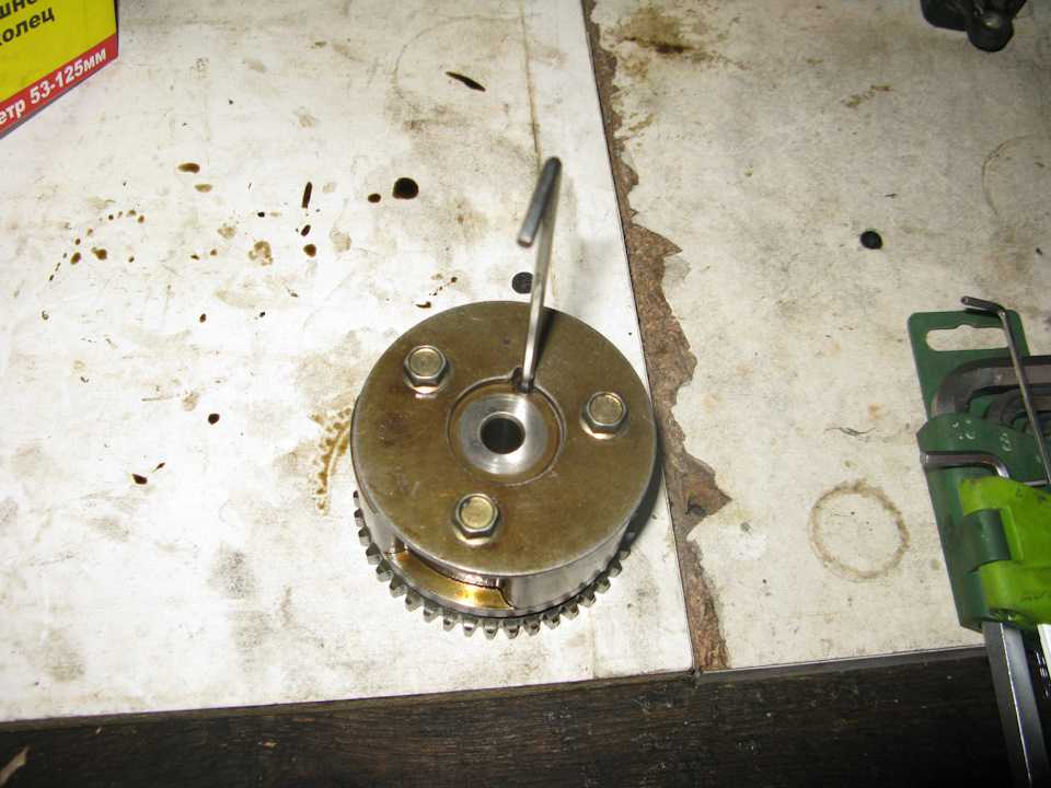 А дальше все по книге, ставил шестеренки на место, совмещая метки, разблокируем натяжитель цепи, крутим коленвал против часовой стрелки, в это время фазовращатель блокируется как ему нужно и все, ГРМ установлен.